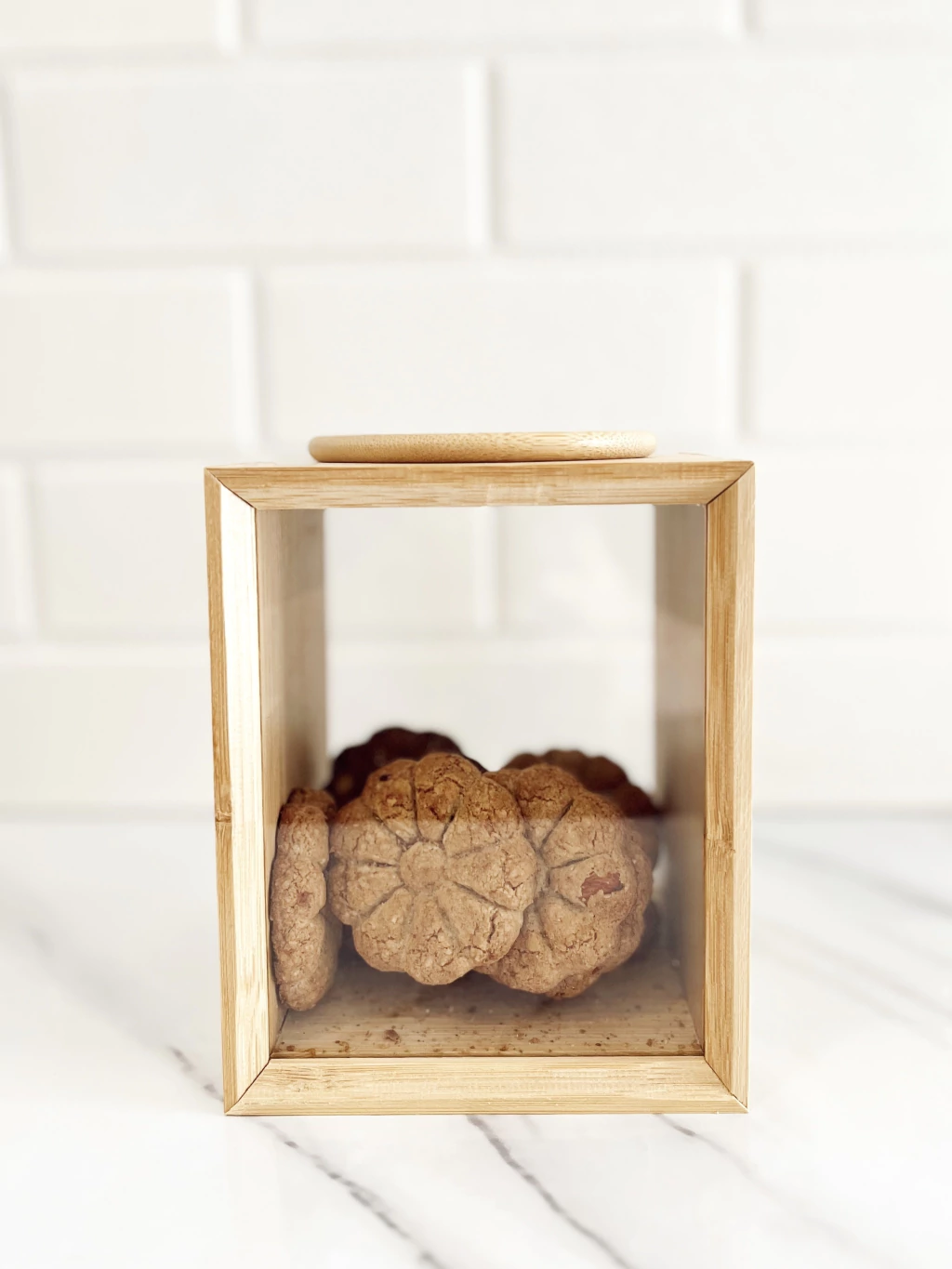 Su estructura de bambú aporta un toque cálido y ecológico, mientras que el visor de vidrio permite identificar fácilmente el contenido sin necesidad de abrirlo. Además, su forma rectangular facilita su colocación en alacenas o estantes, optimizando el espacio.