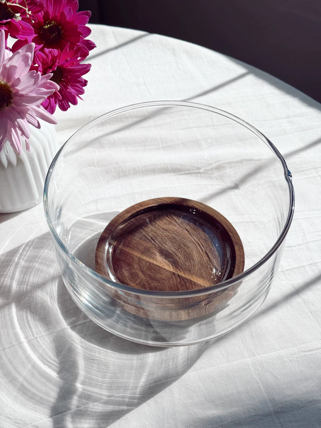 Material: Fuente de vidrio, con base desmontable de madera de acacia.