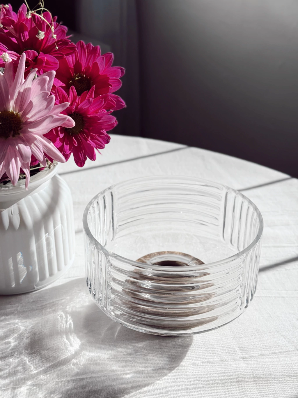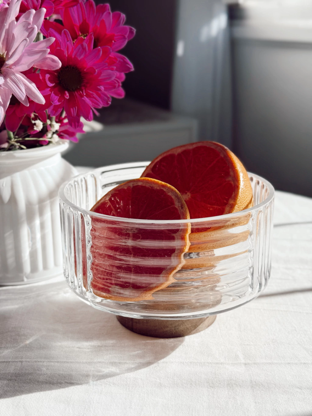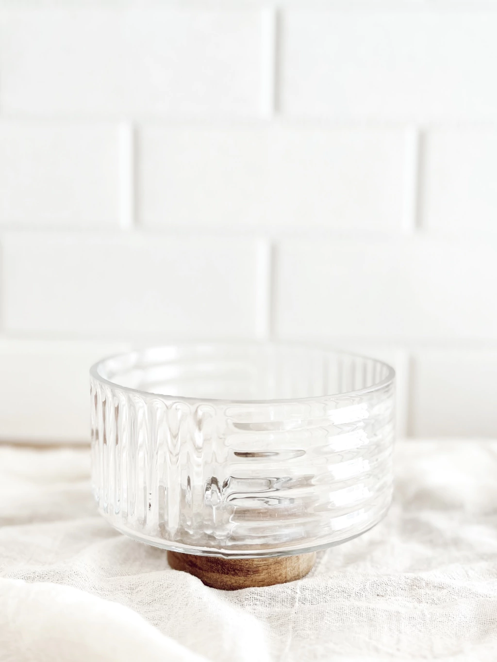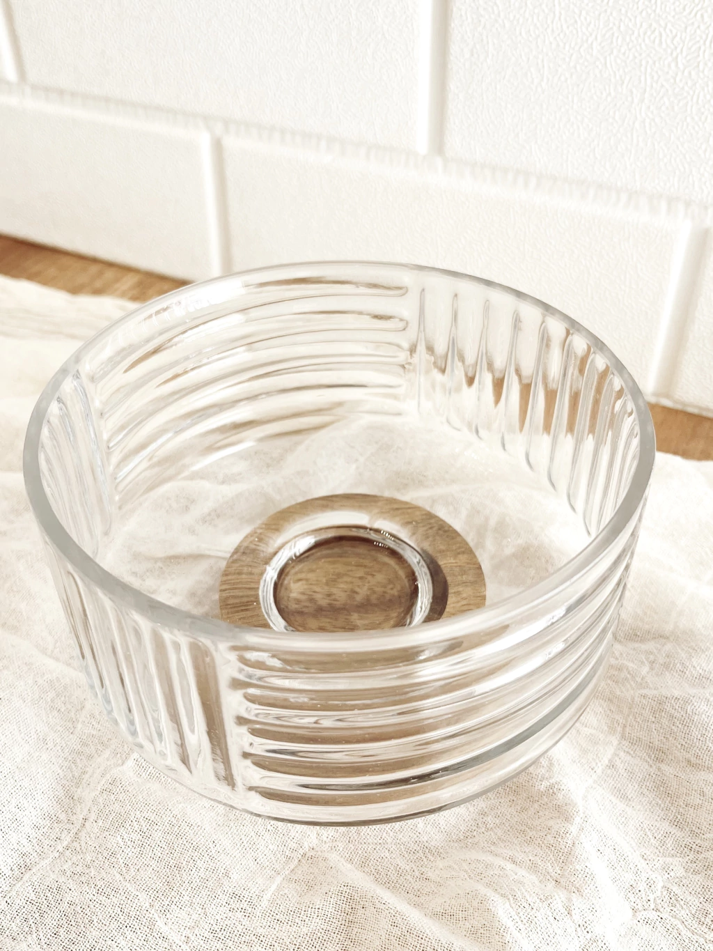 Material: Fuente de vidrio, con base desmontable de madera de acacia.
