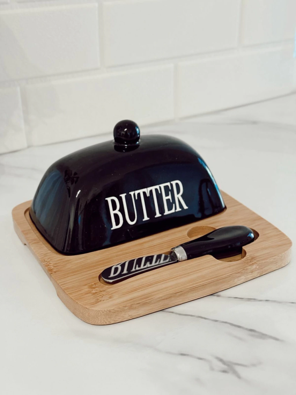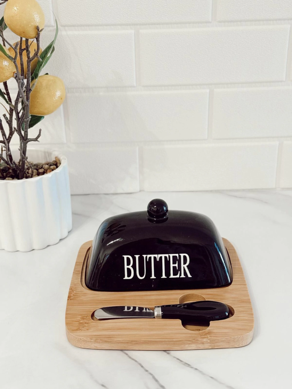 Mantequera NEGRA+ Base Bambu BUTTER. Un accesorio imprescindible con un diseño minimalista y moderno. Su base de bambú natural y su tapa negra crean la combinación perfecta para servir y conservar la manteca con estilo
