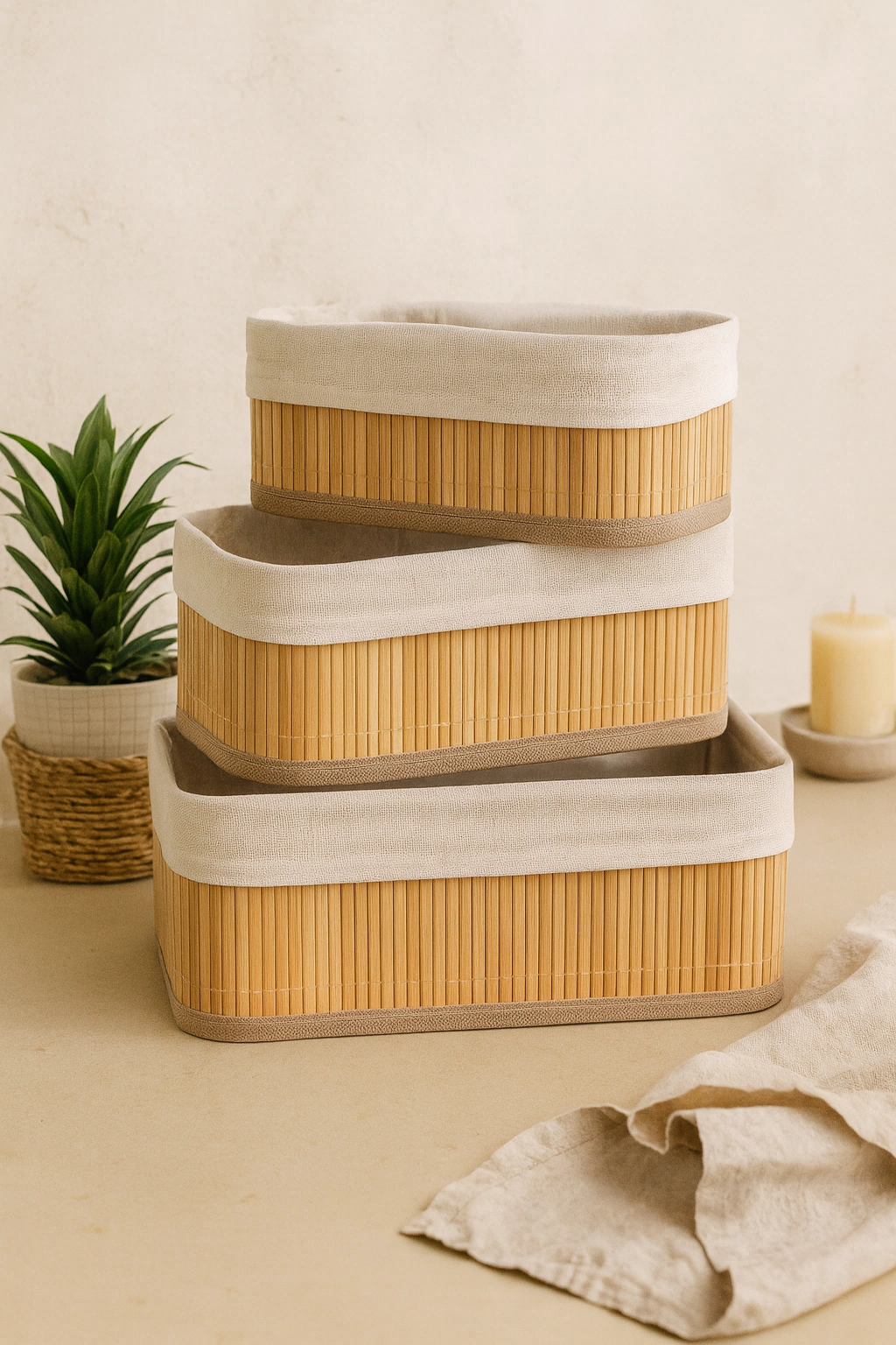 Nuevo set de organizadores de Bambu, con tela en el interior. Ideal para orgarnizar tus espacios, baño, cocina, vestidos y a donde mas te guste. ¡Son super practicos!